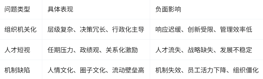 当前,部分中小型央国企在组织管理上依然充斥着浓厚的机关色彩:组织架构层级复杂、决策流程冗长、行政化管理主导,使企业在面对客户需求和市场变化时反应迟缓,难以支撑战略落地和业务创新。在这一前提下,领导层往往因来自行政体系、管理理念转变缓慢,导致企业治理模式与现代市场化企业的差距逐渐拉大。这种机关化管理不仅限制了组织的灵活性和创新力,还严重影响了企业资源配置效率。