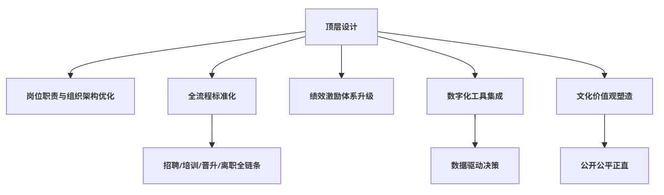 为实现管理规范化,央国企需从顶层设计到具体措施进行系统推进,率先明确岗位职责与组织架构并建立科学的定岗定编模型,从而避免职责重叠和资源浪费,并在此基础上完善人力资源管理全周期流程,其中包括招聘、培训、绩效、激励、晋升等环节,以确保每一项流程都有清晰的制度依据和操作指引。