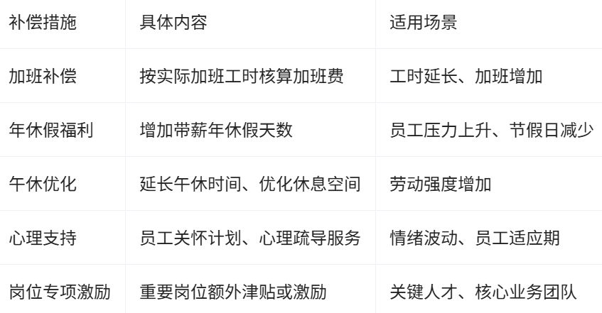 具体来说,在工资不变情况下,企业可以合理调整加班费发放机制,确保加班补偿"实事求是",又或是探索将原有的"固定加班补贴"转向按实际加班计算,既体现公平也优化成本。除此之外,针对员工多上班日带来的压力,企业还可以考虑增加带薪年休假、延长午休时间、提供心理健康支持等人文关怀措施,而对于关键岗位或核心人才则适当设立专项激励,增强其对组织变革的认可度与忠诚度。
