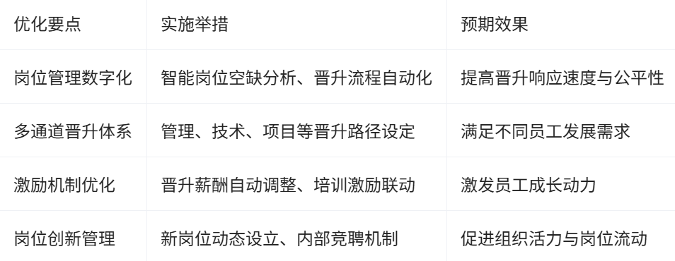 其一,构建智能化岗位管理平台,实现岗位空缺、职级晋升、内部调岗等流程的数字化管理。通过数据驱动分析,企业能够精准识别晋升瓶颈、动态调整岗位结构,从而提升晋升机制的响应速度。在这一过程中,平台可自动匹配晋升资格与推送岗位推荐,增强员工晋升的透明度和公平性。