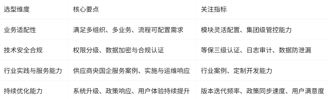 选型过程中的关键在于甄选有央国企经验的合作伙伴,由于央国企业务复杂,组织庞大,标准化和个性化需求并存,供应商的行业理解力和服务能力至关重要——理想的合作伙伴不仅要具备成熟的模块化产品,还需具备本地化适配、行业定制开发和项目管理经验。为此,企业需考察其过往服务案例、实施团队水平及响应速度,重视其与企业实际运营场景的深度匹配能力,在此基础上选择能够提供系统顶层设计、流程重塑和持续优化服务的供应商,从而降低项目风险、确保系统落地与实际业务需求无缝衔接。
