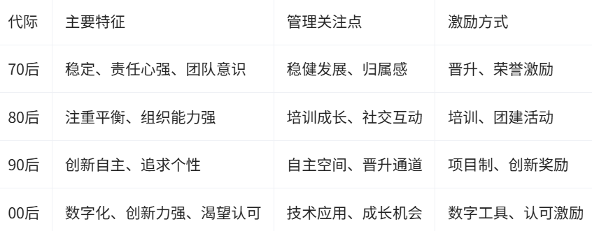 现阶段,央国企的员工结构正经历深刻变革,70后、80后、90后及00后在同一组织中共事,形成了典型的多代际共存局面:70后员工大多承担着中高层管理职责,责任感强,团队意识突出,是企业稳健运行的中坚力量;80后注重工作与生活的平衡,具备较强的组织能力与社交能力,对企业文化和归属感有更高要求;90后渴望自主与创新,追求个性表达和多元发展空间,倾向于灵活的工作方式与快速晋升渠道;而00后则更具数字化素养,对新技术、新模式有天然亲和力,期望在工作中获得认可与成长。