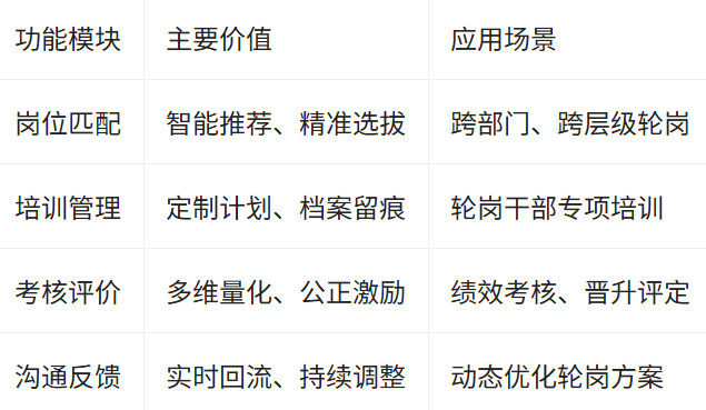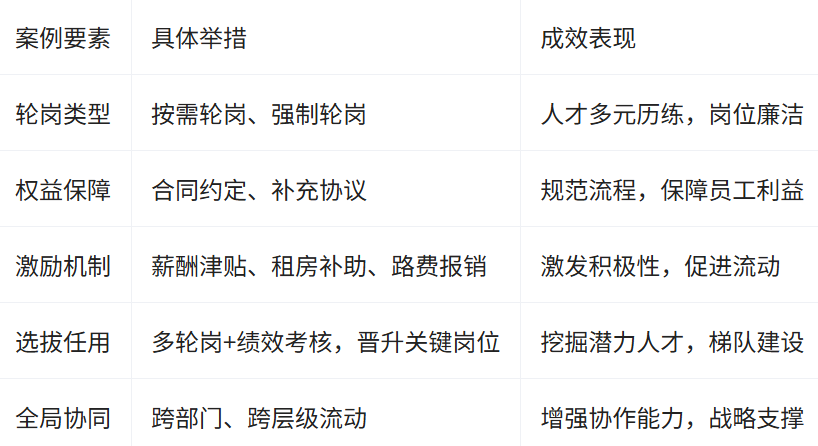 实践证明,轮岗机制不仅加速了内部人才流动,打破部门壁垒,还增强了员工全局视野与跨部门协作能力,为企业战略落地提供了坚实支撑。