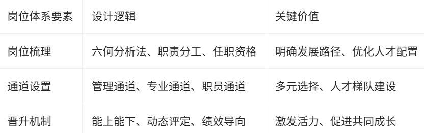 与此同时,企业在岗位梳理过程中还需兼顾企业历史因素与业务现状,确保岗位体系与组织战略高度契合,也只有在岗位职责、能力要求、晋升通道等方面形成科学区分,企业才能为员工提供明确的发展路径、避免“行政管理独木桥”现象,进一步促进人才资源的合理流动与优化配置,而岗位梳理的成果也将直接影响职业发展通道的布局和实施效果,成为实现职业发展通道多元化的基础保障。