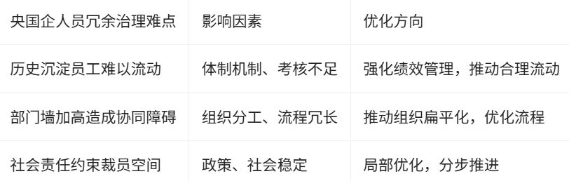 然而在实际操作中,央国企冗余治理往往受到多重现实约束:历史沉淀带来的员工结构复杂,体制机制下的考核和流动难度,以及社会责任对就业稳定的要求,使企业在推进改革时需要兼顾多方利益;与此同时,人员调整和部门优化涉及员工利益、团队稳定和社会影响,任何激进的措施都可能引发内部阻力甚至外部舆论压力,致使许多央国企只能采取渐进式优化,局部试点、分步推进,力求在保障组织效能的同时实现社会责任的平衡。