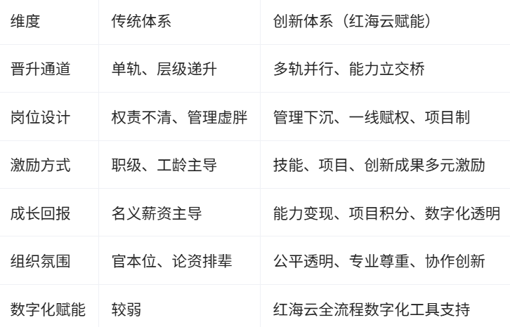 总的来说,Z世代晋升观的嬗变是对央国企组织系统的一次深度体检:只有直面传统体系的桎梏,顺应新一代人才对成长、价值、尊重的多元追求,企业才能激发组织的创新活力与发展潜力。为此,央国企在人力资源管理这一方面需要加快从“职位激励”向“能力驱动”转型,构建以多元成长通道、数字化工具赋能、公平激励机制为核心的新型组织生态,而红海云也将持续以专业的数字化解决方案,助力央国企构建面向未来的高效人力资源管理体系,推动组织与员工共同成长。