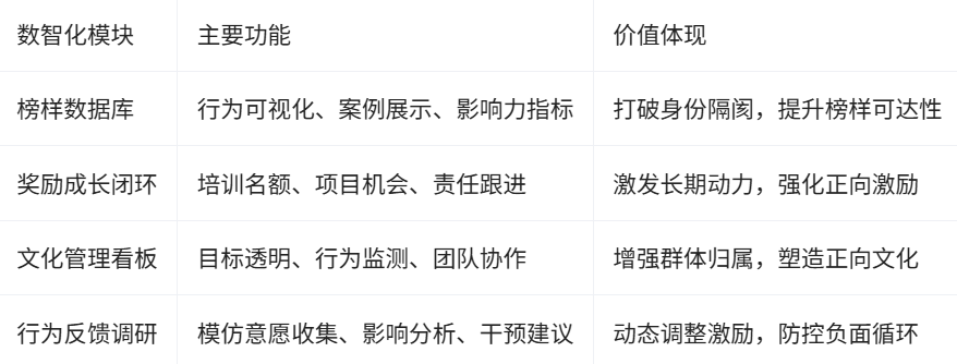 文化场域的持续优化,有助于正向行为的扩散和负面循环的阻断,可见组织文化是决定员工行为归属感和模仿倾向的深层土壤,这意味着企业应通过管理层的示范作用和规范制度,明确工作标准与行为底线。例如,管理层带头践行高效工作、合理作息,公开反对无效加班和消极摸鱼。与此同时,团队数据看板、目标进度公开等数智化手段也将绩效导向转化为员工的团队责任和集体荣誉,通过营造透明、积极的组织氛围使员工更愿意向正向榜样靠拢,自觉远离“坏榜样”行为。