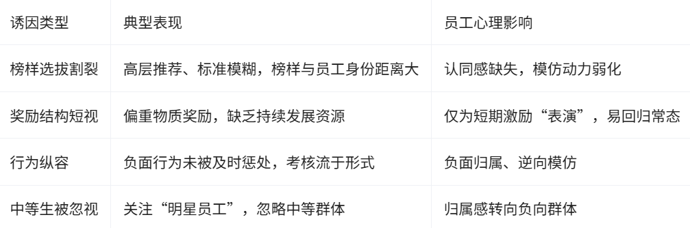 深究“坏榜样”循环不难发现,其根源在于榜样选拔标准、激励结构以及管理层行为的多重失衡:一方面,榜样选拔存在“自上而下”的强推模式,即高管直接推荐、评选标准模糊,使榜样与员工身份严重割裂,基层员工难以产生认同感,榜样作用变得“无足轻重”;另一方面,奖励结构短视且倾向物质激励的现象忽视了员工长期成长和内在动力的培育,在缺乏持续培养和发展机会的情况下,该机制将导致榜样激励只能维持短暂周期,员工行为难以形成稳定的正向惯性。