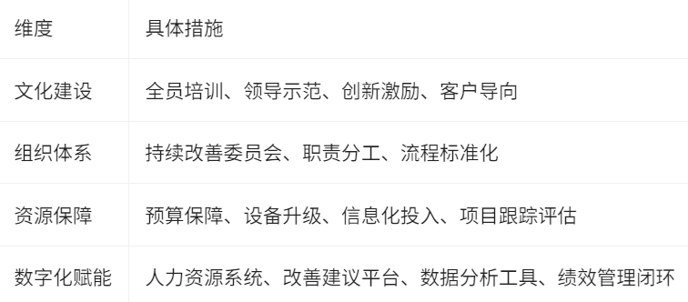 要破解央国企精益化管理与持续改善机制落地的难题,需从顶层设计、机制构建、资源保障与数字化赋能四个维度系统推进: