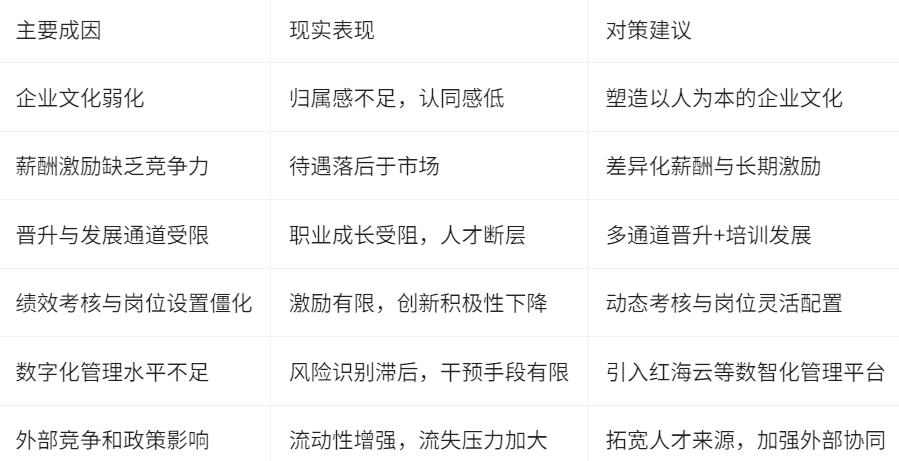 综上所述,央国企核心员工流失率居高不下,归因于企业内在管理机制的滞后以及外部环境的复杂变化,这一现实挑战不仅影响到组织效能和创新能力,更倒逼央国企在转型升级进程中加快人才管理体系和数字化建设的步伐,夯实核心队伍的战略支撑。