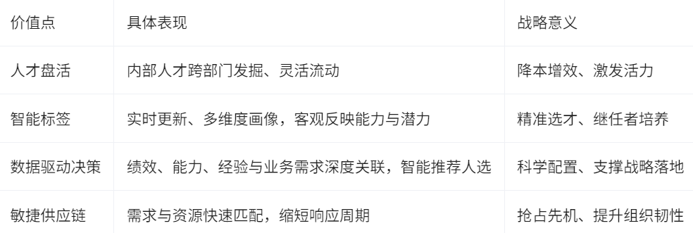 相对应地,AI技术的引入为解决上述痛点提供了全新思路——通过自然语言处理、知识图谱与智能标签等手段,AI能够实现人才数据的高效归集和智能分析,支持需求与资源的秒级精准匹配,让人才调配更加敏捷和科学。信息孤岛被打通后,企业能够全景掌握内部人才分布和潜力动态,及时将合适的人才推送到最需要的岗位上;与此同时,自动化标签和动态画像体系也让员工能力成长路径一目了然,为继任者培养、梯队建设和组织能力优化奠定坚实的数据基础。