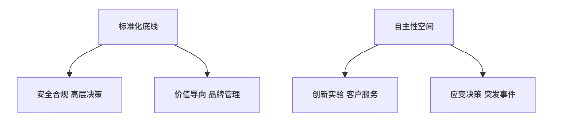与此同时,随着央国企转型升级步伐加快,市场竞争环境日趋复杂,企业也亟需在服务创新、产品研发、客户响应等领域释放更多灵活空间。对于这类需要应变与创新的业务场景,适度赋予基层和专业岗位一定的自主决策权,不仅能激发员工的主观能动性,更有助于提升整体组织的反应效率和创新能力。因此,央国企在管理实践中应科学划定“标准化不可逾越的红线”与“自主性可适度释放的弹性区间”。这一过程可以借助流程梳理、数字化工具和权责明细表,将各类业务活动进行细致分类,做到事前有明确指引、事中有监控反馈、事后有评估修正。