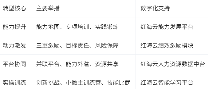 打造平台化协同创新体系是央国企利润中心转型的又一核心举措——借鉴海尔并联平台经验,企业可将专业能力突出、具备市场服务潜力的部门或团队,升级为内部平台,实现能力共享和资源外溢。在这一过程中,平台化协作不仅有助于打破部门壁垒,还能提升跨部门、跨专业的协同创新效率,以红海云人力资源数据中台为例,其能够打通人岗、能力、绩效等多维数据,实现信息流、价值流与人才流的高效联动,助力组织资源最优配置和创新成果快速落地。