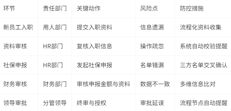 在社保管理中,建立用人部门、HR部门和财务部门三方协同的确认机制是提升流程准确性的关键举措:每月社保缴纳前,HR需要与用人部门详细核对新入职员工名单及社保缴纳需求,确保所有信息无遗漏;随后HR根据入职材料与用人部门名单进行复查,保证员工资料的完整与准确;完成核查后,资料再由财务部门进行终审,财务重点关注申报信息一致性以及缴费金额合理性。通过三方环节层层把关,企业能够有效杜绝因单一部门操作疏漏引发的社保漏缴风险。