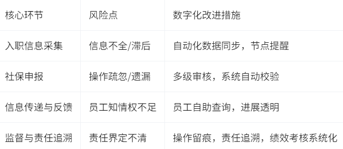 这种情况背后,暴露出央国企社保管理流程中的多重挑战:一方面,流程设计存在盲区,往往依赖个别岗位和人工操作、缺少自动化预警和多级审核,难以及时发现与纠正问题;另一方面,责任划分不够清晰,企业与HR个人之间的权责边界模糊,遇到纠纷时容易产生内部扯皮;此外,管理层对基层HR操作的监督有限,流程异常难以做到实时预警和快速响应。