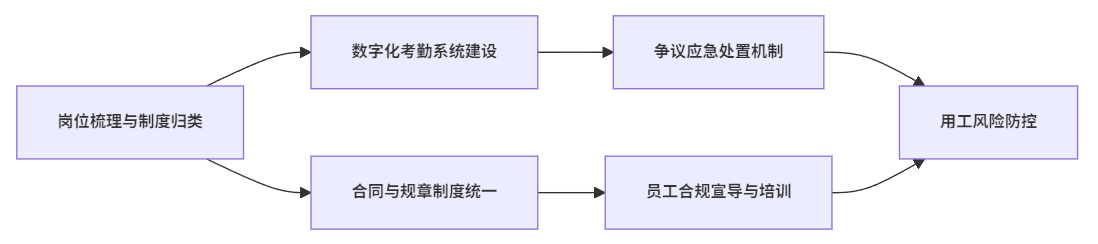 企业应当将岗位说明书、劳动合同、员工手册等重要文本进行内容统一,明确各岗位工时类别、考勤标准和加班报酬等核心条款,做到所有员工对自身权利义务有清晰认知,防止因合同文本与实际管理脱节而引发的劳动纠纷。