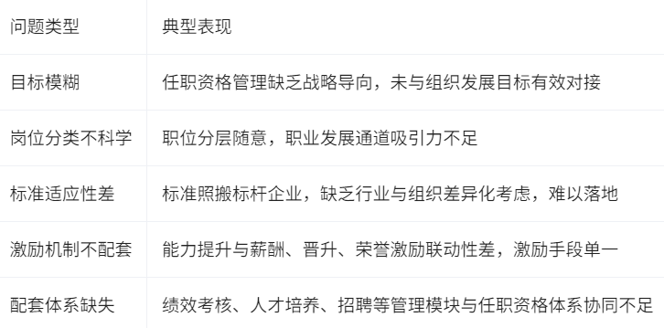 标准制定过于死板且缺少清晰的标准。不少央国企在设定任职资格标准时存在照搬外部模板、脱离实际工作的现象,致使标准过高或过于理想化,员工难以达标,反而挫伤积极性,又或是标准过低或模糊不清,无法起到有效的激励和筛选作用。这种标准适配性的缺失让任职资格体系与实际运营需求脱节,削弱了其管理价值。