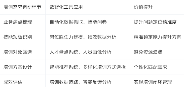 在系统化方法逐步落地的过程中,智能化工具的引入为央国企培训需求调研带来了新的突破——传统调研方式往往受限于人工访谈和手工数据整理,不仅效率低下,还容易受到主观判断影响,难以确保调研结果的科学性与可追踪性;反之,随着数字化转型进程加快,越来越多的央国企开始借助智能化平台,将数据分析与业务流程深度融合,使培训需求调研迈向自动化和智能化的新阶段。