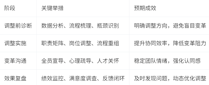 与此同时,HR要在调整过程中设计科学的“缓冲机制”,有效管理组织变革的“副作用”。这包括设立过渡期职责矩阵,明确各岗位在调整期内的责任与权责,防止责任真空和工作断档。通过加强变革沟通、员工心理疏导和关键人才关怀,HR能够稳定团队情绪,降低流失风险,确保改革顺利推进。此外,HR还需建立调整效果的“复盘闭环”,定期评估新架构的实际效能,通过监测决策效率、协同成效、员工满意度等关键指标及时发现并纠正调整过程中出现的新问题,实现组织能力的动态优化。