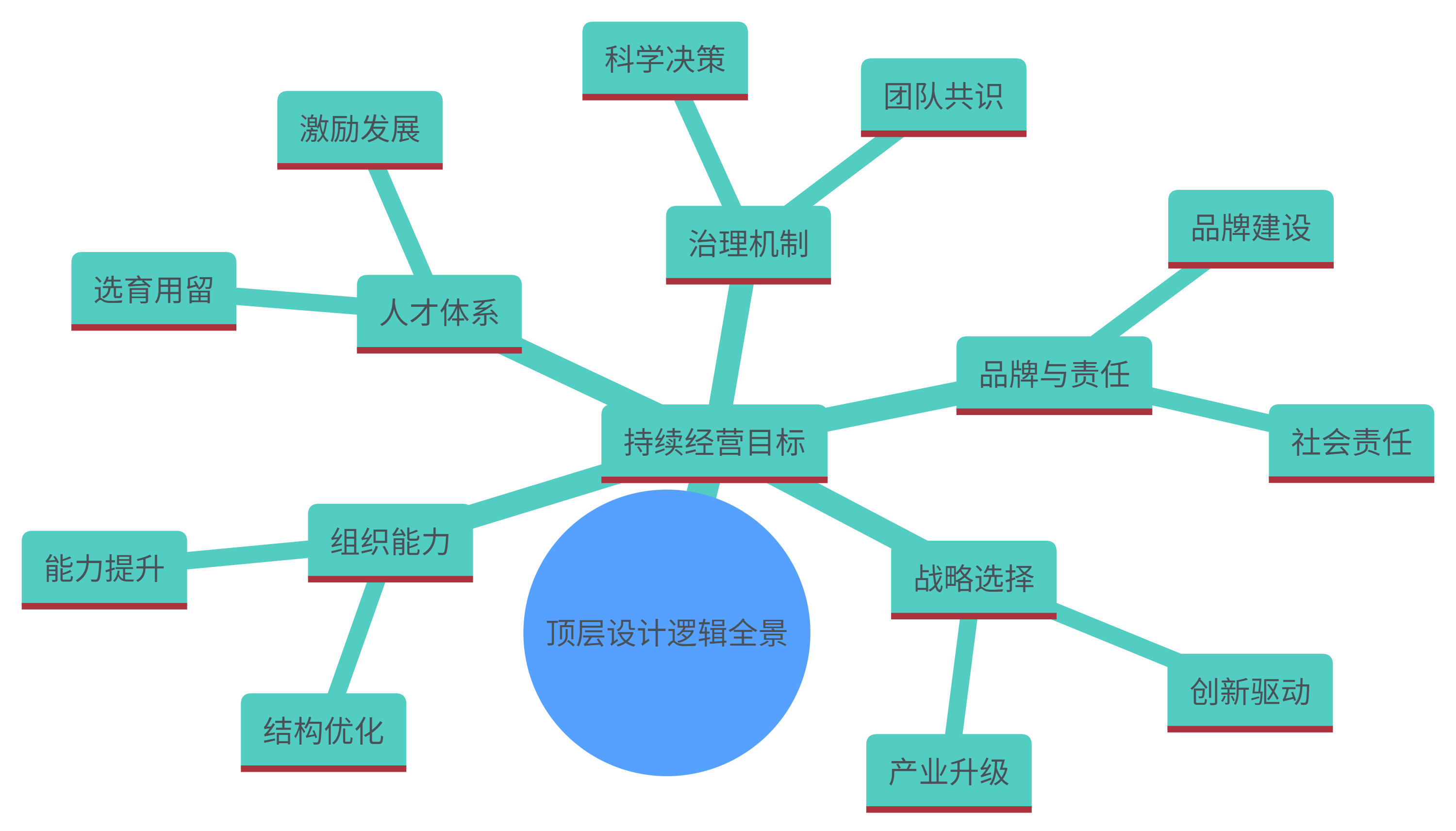 顶层设计原本源于工程学,其核心是以系统思维构建企业蓝图,明确目标、路径与资源配置的底层逻辑,而对于央国企来说,顶层设计不仅仅是战略层面的规划,更是涵盖理念、使命、战略、组织、人才、管理、品牌与社会责任的全方位系统性设计,其本质在于以持续经营为核心目标,围绕“做正确的事”(战略选择)与“做事正确”(组织能力),构建企业从生存、发展到壮大的完整逻辑链条。