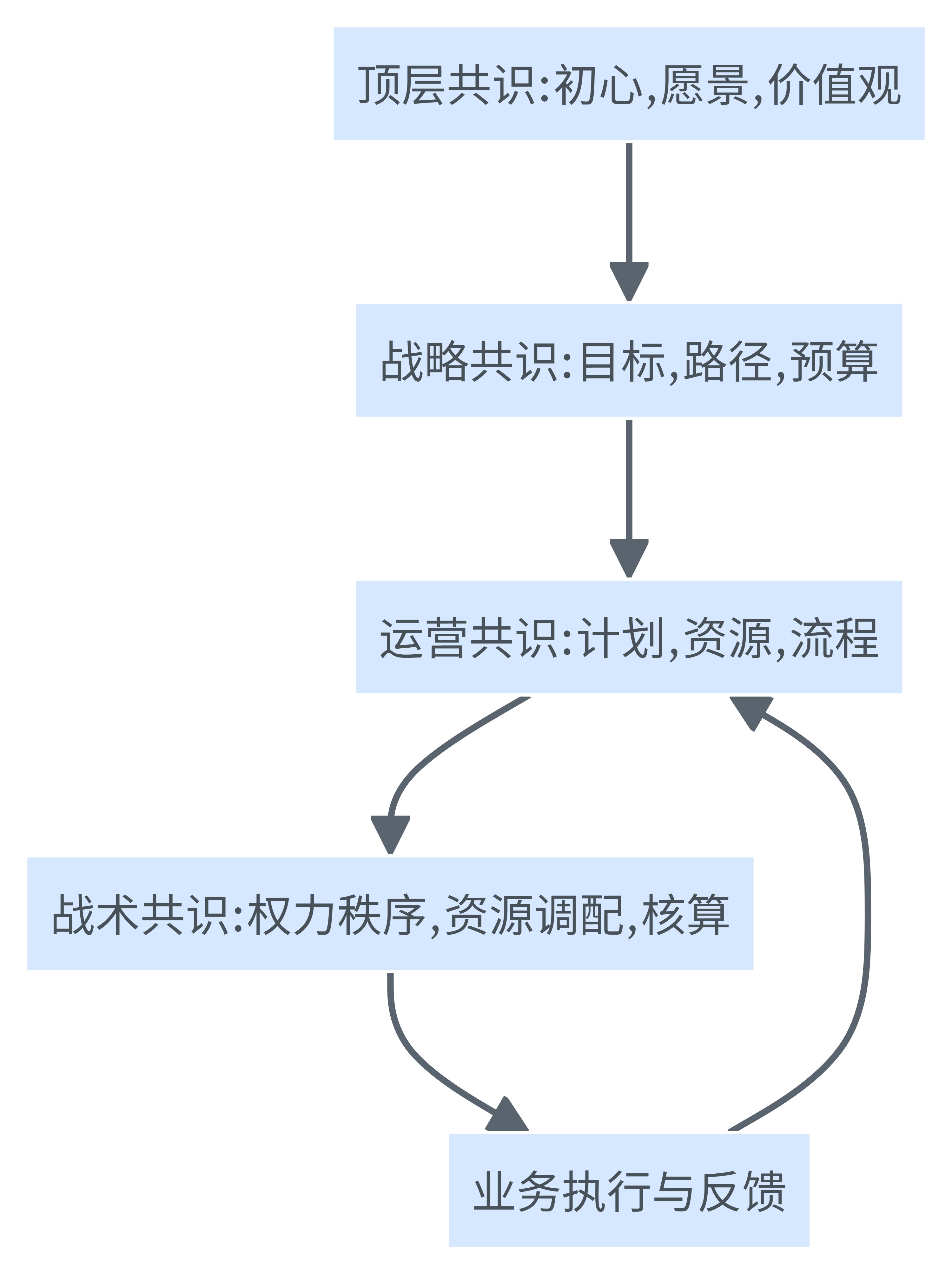 | 顶层共识 | 企业愿景、创始人公约、价值观 | 明确方向、统一思想 |